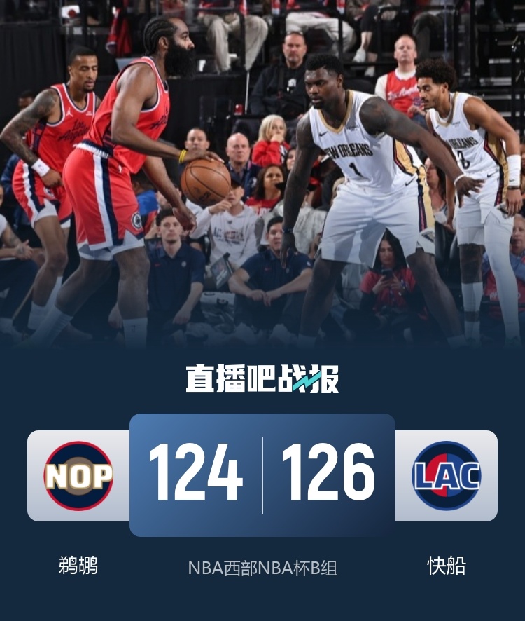 首节对决面对西部倒数第一的鹈鹕,快船除了开局短暂领先外一路被动追分;次节快船迅速回暖,虽然防守端被对手砍下31分,但他们回敬回敬41分,哈登领衔替补上来先送9-0的攻势扭转战局,末段哈登连续送上三分进球帮助快船取得8分优势进入下半场。休息归来快船虽然一直维持着10分上下的优势但也占不到便宜埋下隐患,鹈鹕则在第四节送上净胜10分的攻势一举抹平分差;末段成为小卡和锡安的对决,小卡连砍12分一度让快船看到取胜希望,但却最后一次失误让锡安制造犯规两罚抹平比分,但最后时刻小卡立刻站出来完成压哨绝杀。最终,快船力克鹈鹕顺利收下比赛。
